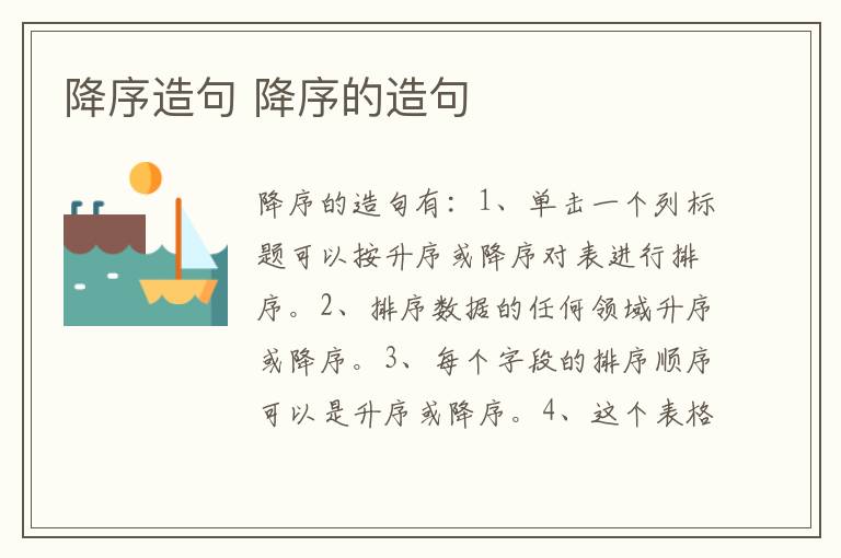 降序的造句有:1、单击一个列标题可以按升序或降序对表进行排序。2、排序数据的任何领域升序或降序。3、每个字段的排序顺序可以是升序或降序。4、这个表格可以按任何列的升序或降序排序。