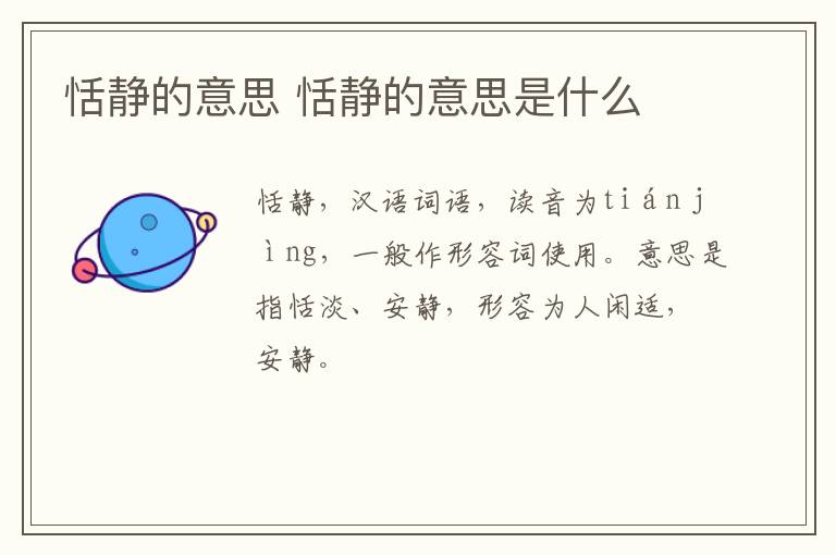 恬静的意思 恬静的意思是什么 知识分享 23年2月18日 编辑 童画 取消关注 关注 私信 恬静,汉语词语,读音为tiánjìng,一般作形容词使用。意思是指恬淡、安静,形容为人闲适,安静。恬静一词出自《东观汉记·闵贡传》:“闵贡字仲叔,太原人也。恬静养神,弗役於物。” 恬静的近义词有:安静、幽静、宁静、安然 反义词有:恬噪、喧嚣、喧闹、吵闹 词语造句:她是个恬静的姑娘,总是默默地坐在一旁看书。 No related posts. 本文内容由互联网用户自发贡献,该文观点仅代表作者本人。本站仅提供信息存储空间服务,不拥有所有权,不承担相关法律责任。如发现本站有涉嫌抄袭侵权/违法违规的内容, 请发送邮件至 2245678901@qq.com 举报,一经查实,本站将立刻删除。 给TA打赏 共{{data.count}}人 人已打赏