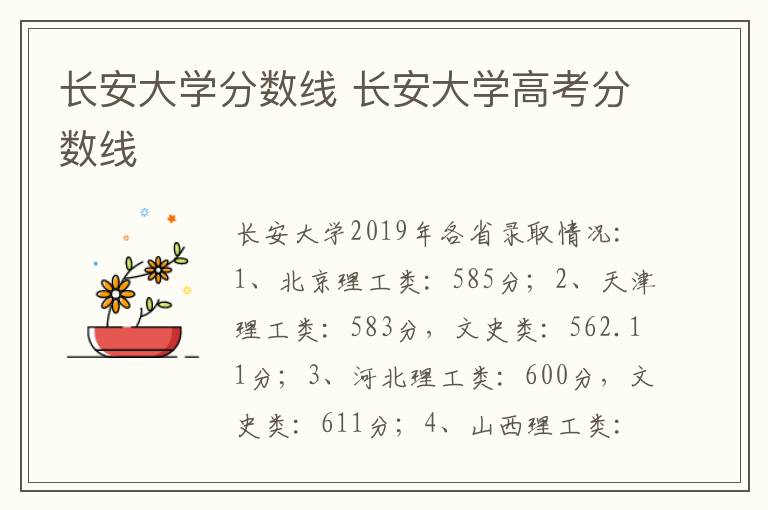 长安大学2019年各省录取情况:1、北京理工类:585分;2、天津理工类:583分,文史类:562.11分;3、河北理工类:600分,文史类:611分;4、山西理工类:554分,文史类:569分;5、内蒙古理工类:548分;文史类:585分;6、辽宁理工类:595分。