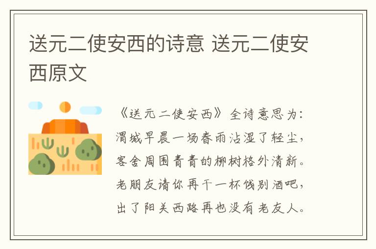 《送元二使安西》是唐代诗人王维创作的一首诗。全诗为:“渭城朝雨浥轻尘,客舍青青柳色新。劝君更尽一杯酒,西出阳关无故人。”