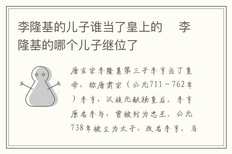 唐玄宗李隆基第三子李亨当了皇帝,称唐肃宗(公元711-762年)李亨,汉族元献杨皇后。李亨原名李与,曾被封为忠王。公元738年被立为太子,改名李亨。马嵬驿兵变杨贵妃死后,唐玄宗西逃,李亨继位。李亨在位6年,在宫廷政变中惊忧而死,终年51岁,葬于建陵(今陕西省醴泉县东北18里的武将山)。