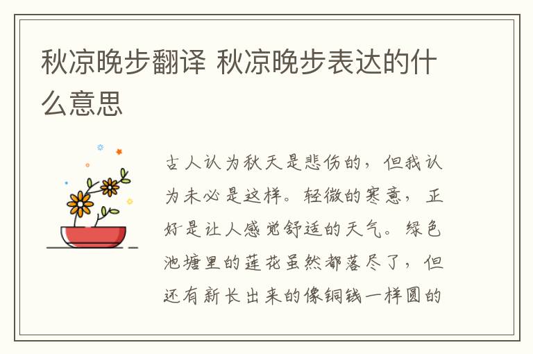 《秋凉晚步》的翻译:古人认为秋天是悲伤的,但我认为未必是这样。轻微的寒意,正好是让人感觉舒适的天气。绿色池塘里的莲花虽然都落尽了,但还有新长出来的像铜钱一样圆的小荷叶。