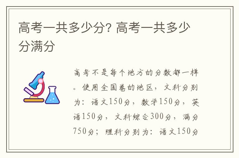 高考不是每个地方的分数都一样。使用全国卷的地区,文科分别为:语文150分,数学150分,英语150分,文科综合300分,满分750分;理科分别为:语文150分,数学150分,英语150分,理科综合300分,满分750分。部分省份不是750,例如上海高考总分数为660分。。