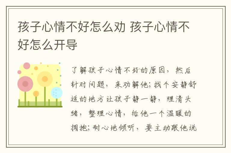 了解孩子心情不好的原因,然后针对问题,来劝解他;找个安静舒适的地方让孩子静一静,理清头绪,整理心情,给他一个温暖的拥抱;耐心地倾听,要主动跟他说话,帮他打开话匣子,这时你一定要做个好的倾听者和交流者。