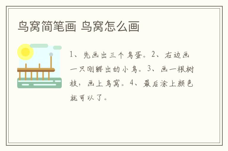 鸟窝简笔画 鸟窝怎么画简单又漂亮 知识分享 23年2月18日 编辑 童画 取消关注 关注 私信 1、先画出三个鸟蛋。 2、右边画一只刚孵出的小鸟。 3、画一根树枝,画上鸟窝。 4、最后涂上颜色就可以了。 No related posts. 本文内容由互联网用户自发贡献,该文观点仅代表作者本人。本站仅提供信息存储空间服务,不拥有所有权,不承担相关法律责任。如发现本站有涉嫌抄袭侵权/违法违规的内容, 请发送邮件至 2245678901@qq.com 举报,一经查实,本站将立刻删除。 给TA打赏 共{{data.count}}人 人已打赏