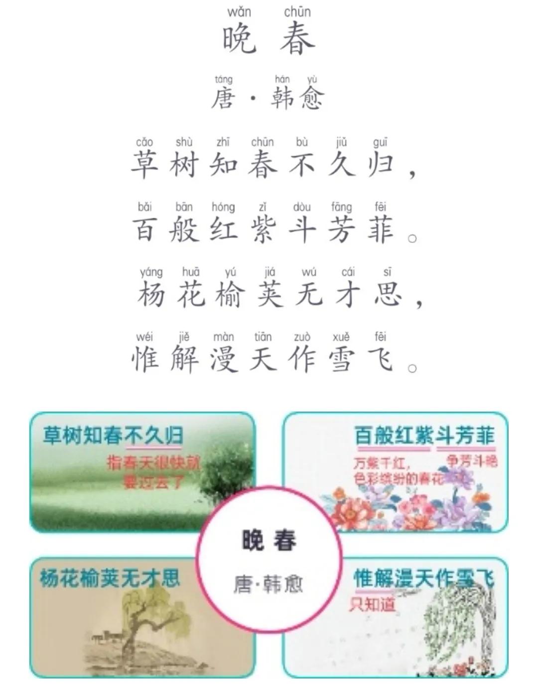 这是一首写暮春景物的七绝。此诗运用拟人的修辞手法,通过描写花草树木得知春天不久就要归去,于是各逞姿色,争芳斗艳,欲将春天留住,就连那本来没有任何姿色的杨花、榆荚也不甘示弱,好像雪花随风飞舞,加入了留春的行列。全诗表达了诗人惜春的思想感情,同时也蕴含应抓住时机,乘时而进,创造美好未来之意。