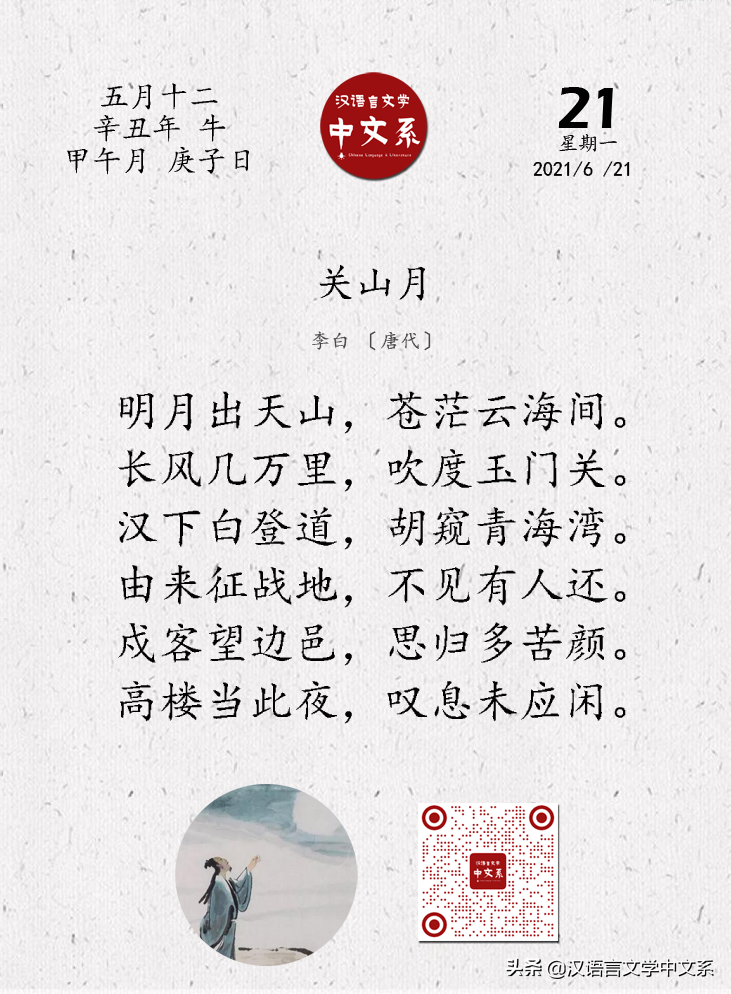 《关山月》 是汉代乐府歌曲之一,属于 “鼓角横吹曲”,是当时守边将士经常在马上奏唱的。李白这首诗在内容上仍继承古乐府,但笔法独到,翻古意而又有所创新。诗人抒写了古代边防战士的艰难困苦,谴责非正义的战争给人民带来的苦难,借以影射批判唐代统治阶级的穷兵黩武,表现了反对侵略战争的主题。