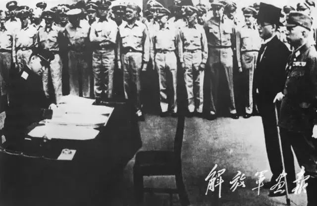 在九个受降国代表的注视下,曾在中国国土上不可一世的侵略者低头签署了投降书。