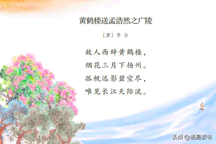 我在黄鹤楼同老朋友孟浩然挥手告别,他在这阳春三月乘着船要顺流东去扬州。帆影在蓝天的背景中渐去渐远而终于消失,只有长江水向着东方天际滚滚流去。