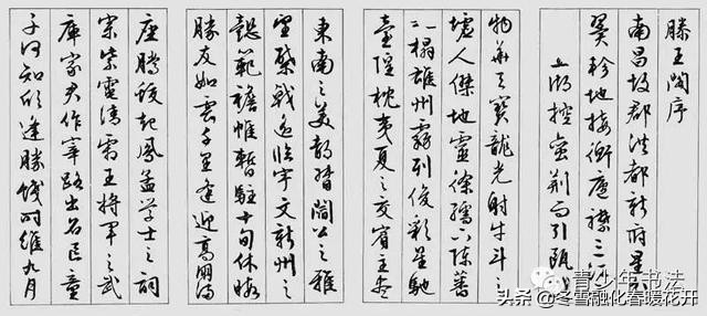 勃,三尺微命,一介书生。无路请缨,等终军之弱冠(guàn);有怀投笔,慕宗悫(què)之长风。舍簪(zān)笏(hù)于百龄,奉晨昏于万里。非谢家之宝树,接孟氏之芳邻。他日趋庭,叨(tāo)陪鲤对;今兹捧袂(mèi),喜托龙门。杨意不逢,抚凌云而自惜;钟期既遇,奏流水以何惭?呜呼!胜地不常,盛筵(yán)难再;兰亭已矣,梓(zǐ) 泽丘墟。临别赠言,幸承恩于伟饯;登高作赋,是所望于群公。敢竭鄙怀,恭疏短引;一言均赋,四韵俱成。请洒潘江,各倾陆海云尔。