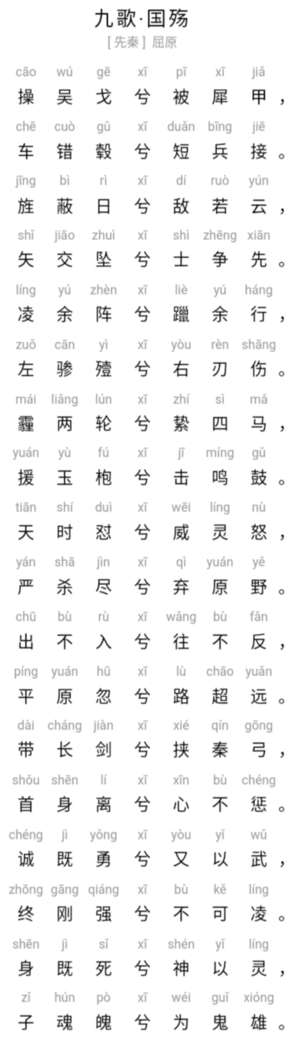《九歌》是一组祭歌,共11篇,是屈原据民间祭神乐歌的再创作。《九歌·国殇》取民间“九歌”之祭奠之意,以哀悼死难的爱国将士,追悼和礼赞为国捐躯的楚国将士的亡灵。乐歌分为两节,先是描写在一场短兵相接的战斗中,楚国将士奋死抗敌的壮烈场面,继而颂悼他们为国捐躯的高尚志节。由第一节“旌蔽日兮敌若云”一句可知,这是一场敌众我寡的殊死战斗。当敌人来势汹汹,冲乱楚军的战阵,欲长驱直入时,楚军将士仍个个奋勇争先。但见战阵中有一辆主战车冲出,这辆原有四匹马拉的大车,虽左外侧的骖马已中箭倒毙,右外侧的骖马也被砍伤,但他的主人,楚军统帅仍毫无惧色,他将战车的两个轮子埋进土里,笼住马缰,反而举槌擂响了进军的战鼓。一时战气萧杀,引得苍天也跟着威怒起来。待杀气散尽,战场上只留下一具具尸体,静卧荒野。