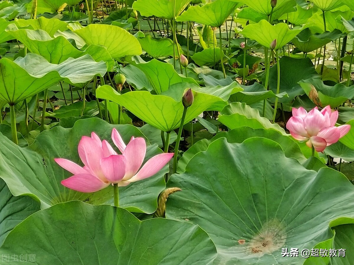 “江南可采莲”,“可”在这里是适宜、正好的意思。为什么说江南适宜采莲,是采莲的好地方呢?你看啊,江南不仅仅是到处都生长着莲。而且目之所及, “莲叶何田田”。到处是圆润碧绿、劲秀挺拔的莲叶呀!何田田是对莲叶的极度赞美——多么圆润的莲叶啊、多么挺秀的莲叶啊……