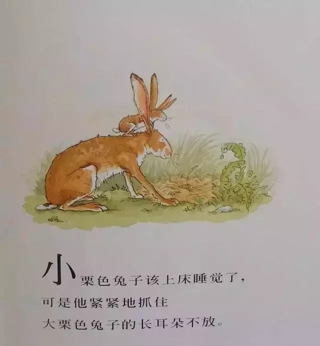 大兔子把小兔子抱起来,甩过自己的头顶,“我爱你一直到你的脚趾头。