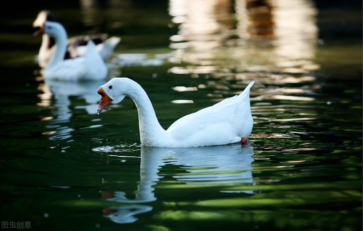 后三句,曲项向天歌,白毛浮绿水,红掌拨清波。每一句都是简单的主谓宾结构,从上到下对鹅进行简单描绘,十分符合小孩子的语言习惯和观察习惯。其中,曲项,就是弯着脖子的意思。这三句的意思是,那池塘里的大白鹅啊,正弯曲着脖子,伸向蓝天引吭高歌,它们雪白的羽毛漂浮在碧绿的水面上,透过清澈的塘水,可以让人看到红色的脚掌在不停地拨动,在身后留下一道道清亮的水波。其中的“白、绿、红、青”四字,既有句中对,又有上下对,色彩艳丽,妙趣横生。