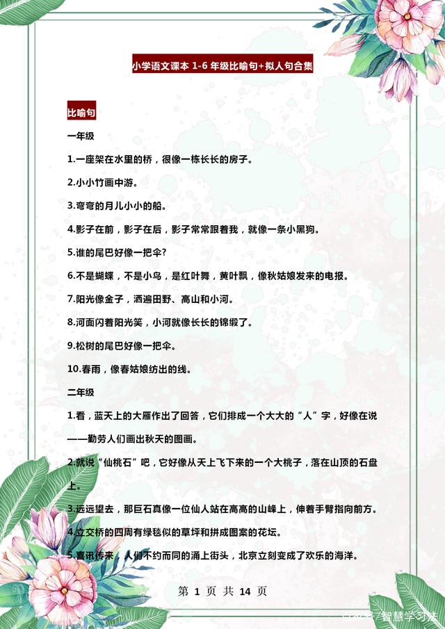 语文班主任:小学语文1-6年级比喻句+拟人句合集,打基础好资料!