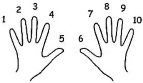 我们身体真的很奇妙,手是一个常见的计算器。最常见的手的计算是9的倍数计算。家长可能不理解,但是很多小孩子很快就能学会。计算9的倍数时,将手放在膝盖上,像下图中所示,从左到右给你的手指编号。