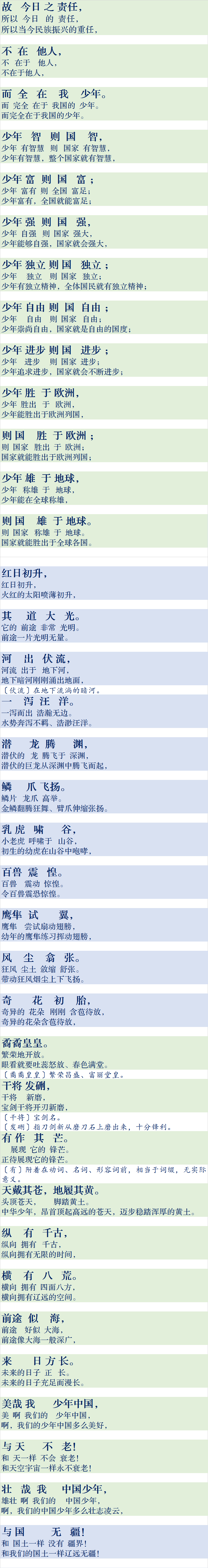 本篇文章写于1900年,全文较长,为了适合小学生学习阅读,仅截取了最后的一部分。当时戊戌变法刚刚失败,国内满清皇族的顽固旧势力还在做最后的残喘,在外各国列强对中华大地虎视眈眈,国家、民族正处在风雨飘摇之中。梁启超针对列强对我们“老大帝国”的偏见写下此文,指出满清这个“老大帝国”已是不雕之木、待死之国,“昨日割五城,明日割十城,处处雀鼠尽,夜夜鸡犬惊。”只有寄希望于少年一代,只有少年的进取、豪壮、冒险才能挽救民族的危亡。他用激情澎湃的文笔,为即将涅槃新生的“少年中国”勾画出壮丽的图景,激励中国少年励精图强,拯救民族于水火之中。