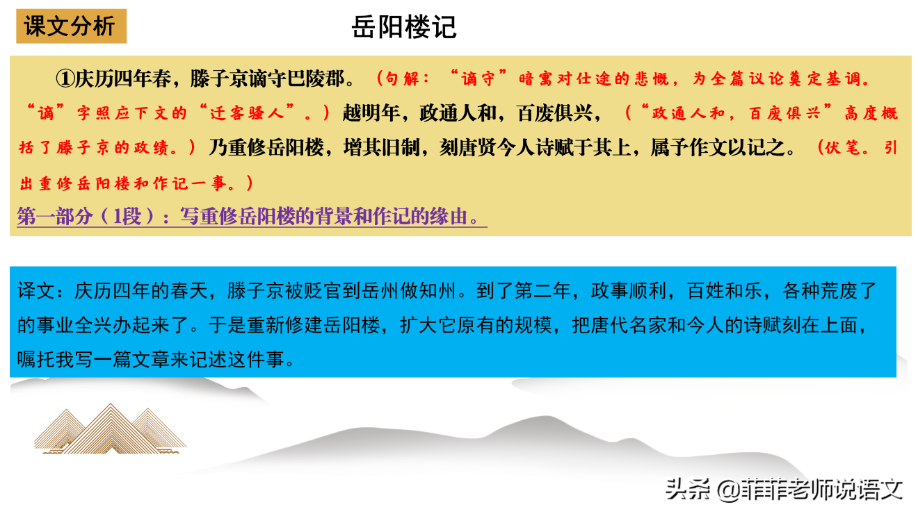 范仲淹,字希文,谥号文正。北宋政治家、军事家、文学家。范仲淹二岁而孤,家贫无依,而少有大志,以天下为己任。在母亲教育下发愤苦读,惫甚,辄以凉水沃面;食不给,啖粥而读。考取进土,镇守西北边疆,抵抗西夏,使西夏不敢进犯北宋。1043年任参知政事(副宰相) ,实行政治改革,失败。范仲淹、欧阳修、滕子京等改革官员先后被贬谪偏远之地。范仲淹被贬到邓州任太守。