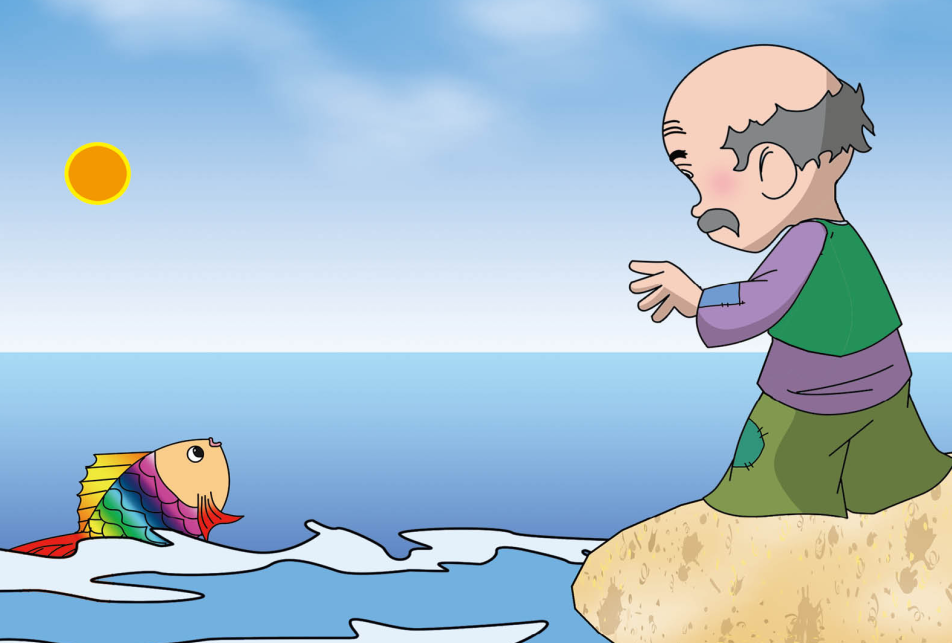 一天,老公公捕到一条七彩的金鱼。金鱼突然开口说:“老爷爷,放了我吧!你要什么我就给你什么!”