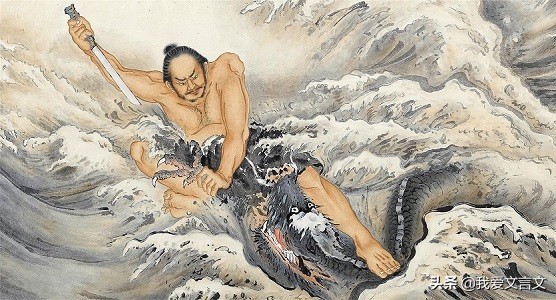 楚国有个叫次非的人,他在干遂得到一把宝剑。返回楚国时需要渡江,到了江中央,有两条蛟龙从两边缠绕住他乘的船。次非对船工说:“你曾经见过有两条蛟龙缠绕住的船,而船上的人能活下来的吗?”船工回答说:“我从未见过。”次非捋起袖子,撩起衣服,拔出宝剑说:“这只不过是江中的一堆腐烂的骨肉罢了。如果我舍弃宝剑能保全大家的生命,我有什么吝惜的呢?”于是跳入江中刺杀蛟龙,杀了蛟龙然后又回到船上。船上的人都得以活命。