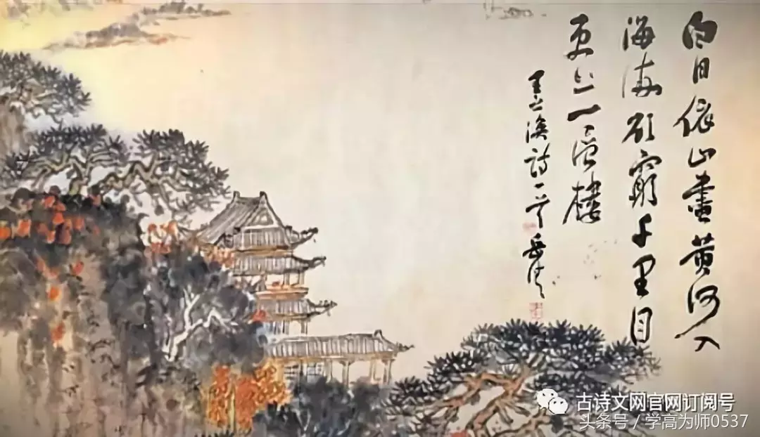 诗人眼前所呈现的,是一幅溢光流彩、金碧交辉的壮丽图画。这幅图画还处于瞬息多变的动态之中。白日依山而尽,这仅仅是一个极短暂的过程;黄河向海而流,却是一种永恒的运动。如果说.这种景色很美,那么,它便是一种动态的美,充满了无限生机的活泼的美。这不是所谓“定格”,不是被珍藏的化石或标本。读者深深地为诗人的大手笔所折服。后两句写所想。“欲穷千里目”,写诗人一种无止境探求的愿望,还想看得更远,看到目力所能达到的地方,唯一的办法就是要站得更高些,“更上一层楼”。“千里”“一层”,都是虚数,是诗人想象中纵横两方面的空间。“欲穷”“更上”词语中包含了多少希望,多少憧憬。这两句诗,是千古传诵的名句,既别翻新意,出人意表,又与前两句诗承接得十分自然、十分紧密;同时,在收尾处用一“楼”字,也起了点题作用,说明这是一首登楼诗。从这后半首诗,可推知前半首写的可能是在第二层楼所见,而诗人还想进一步穷目力所及看尽远方景物,更登上了楼的顶层。诗句看来只是平铺直叙地写出了这一登楼的过程,而含意深远,耐人探索。这里有诗人的向上进取的精神、高瞻远瞩的胸襟,也道出了要站得高才看得远的哲理。就全诗的写作特点而言,这首诗是日僧空海在《文镜秘府论》中所说的“景入理势”。有人说,诗忌说理。