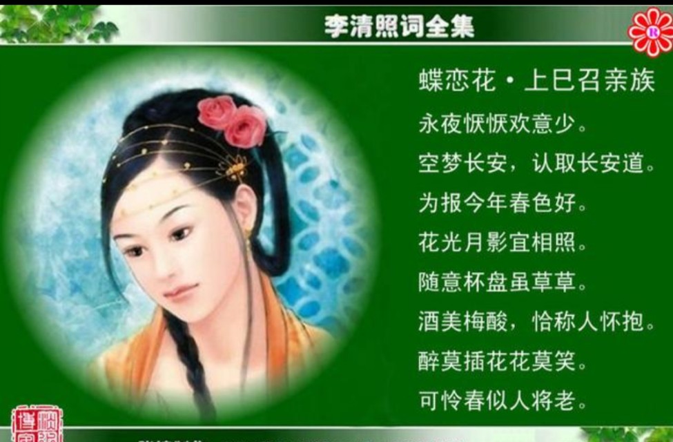 李清照(1084-1155),济南章丘人,号易安居士。宋代女词人,婉约词派代表,有“千古第一才女”之称。论词强调协律,崇尚典雅,提出词“别是一家”之说,反对以作诗文之法作词。部分篇章感时咏史,情辞慷慨,与其词风不同。