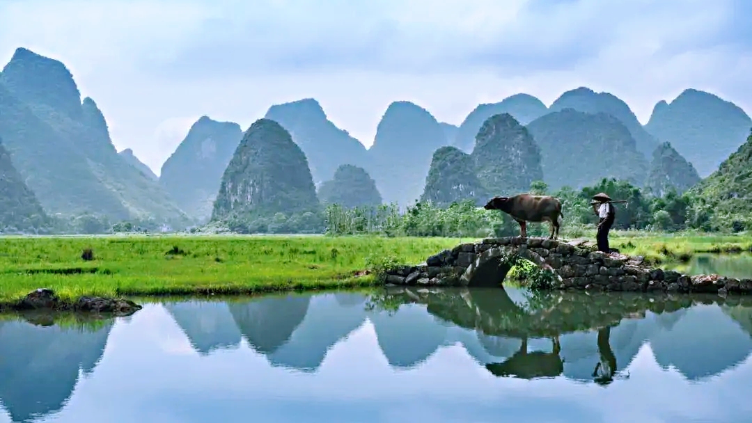 怪石,翠竹,牧童,老牛,组成了一幅恬静美好的乡村生活的田园画卷,令人向往。