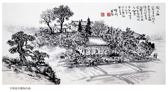 陶公庙,位于黄梅木鱼山上。山上茂林修竹,风光秀丽。本图系陶侃后代陶培峰所绘。