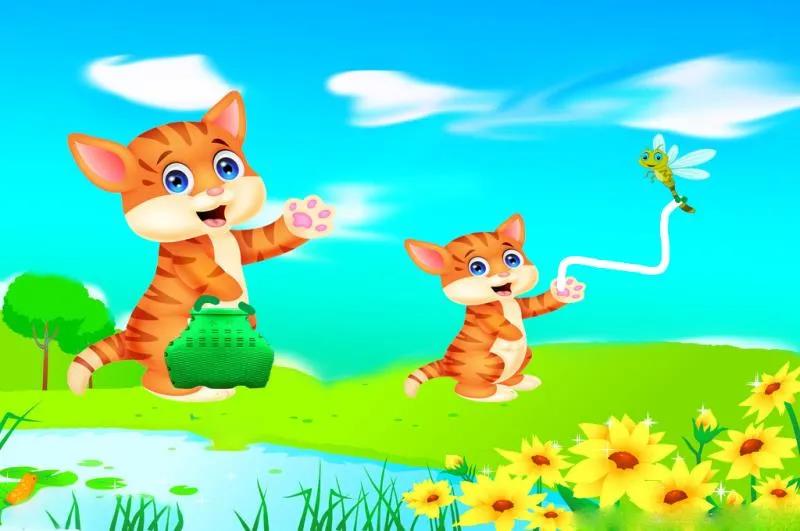 钓着钓着一只蜻蜓飞来了,小猫放下钓鱼竿就去抓蜻蜓。小猫一跳又一跳,扑了一下,又扑了一下。蜻蜓飞走了,小猫没抓着。空着手来到小河边,一看,猫爸爸钓着了一条大鱼,小猫很是羡慕啊!小猫,安心地坐下钓鱼,钓着钓着,一只蝴蝶飞来了,小猫放下钓鱼竿就去抓蝴蝶,一跳又一跳,扑了一下又一下,向上一窜,呀,一只小飞虫跑到了小花猫的眼里,小猫,赶紧的,到了小河边用水洗眼,花花花花洗了好几下,小飞虫洗出去了,小猫眨眨眼,眼睛不难受了。小猫一看爸爸又钓着了一条大鱼。小猫说,真气人,我怎么一条小鱼也钓不着呢?猫爸爸说,你一会儿钓鱼,一会儿抓蜻蜓,一会儿抓蝴蝶,你到底想干什么呀?小猫说嗯,我想抓蜻蜓。猫爸爸说,用手抓蜻蜓。当然不好抓啦,你拿这个网兜去捞蜻蜓吧!爸爸帮你一起,爸爸给你赶。小猫站在东边,爸爸站在西边。哦哦,过去吧,爸爸赶蜻蜓。小猫拿着网兜刷的一下刷的一下,蜻蜓进了网兜里,小猫捉住了一只蜻蜓,高兴地叫起来。蜻蜓爸爸,蜻蜓我抓住蜻蜓了。哦,抓住蜻蜓了,爸爸帮你系上。回家吧。爸爸提着鱼桶,小猫放着蜻蜓,就像放着一个蜻蜓风筝。在回家的路上,小猫一边走一边唱歌。我高兴,我高兴,我抓住蜻蜓了。你真棒,你真棒,你会抓蜻蜓。