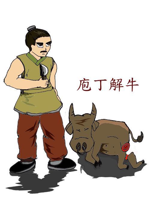 顺应自然,物我合一,本是道家的追求,庖丁以此为解牛之方,才使他由“技”进于“道”,达到炉火纯青、技艺超群的地步。“动刀甚微,謋然已解,如土委地”,这十二字是对庖丁解牛效果的描绘,方法对头,不仅牛解得快,刀子也不受损害。十九年来,解牛数千头,竟未换过一把刀,刀刃还是锋利如初。这当然是每月换一把刀的低级厨工所不可思议的。区别就在于他们求于“技”,而庖丁志于“道”。