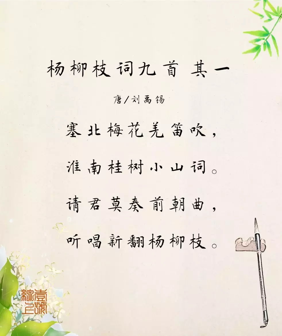 “塞北梅花羌笛吹”,这里“梅花”是指汉乐府《梅花落》曲,意思是说塞北的《梅花落》歌曲是用笛子演奏的。该曲调流行后,后世许多文人依此曲写了很多《梅花落》歌词,都是歌咏梅花的。“淮南桂树小山词”,西汉淮南王刘安门客小山作《招隐士》,里面有好几句写到桂树的。所以用桂树指代《招隐士》篇,该篇中“王孙游兮不归,春草生兮萋萋”句生出了后世的《王孙游》曲。诗人同时提到《梅花落》曲和《招隐士》词,意在说明既然古时流行的曲词都可以不断加以再创作,那《杨柳枝词》也可以不断改进,进行新的创作。